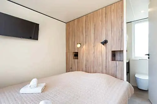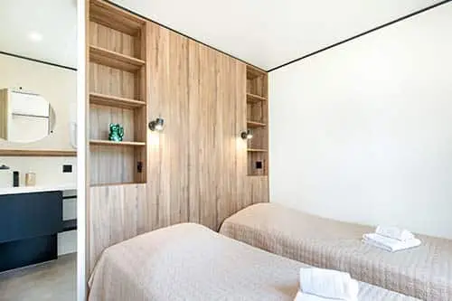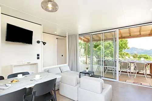 Dieses Premium-Mobilheim für bis zu 6 Personen beeindruckt durch sein modernes Design, seine außergewöhnliche Helligkeit und seine Ausstattung auf Hotelniveau – eingebettet in die herrliche Natur des Esterel-Gebirges.