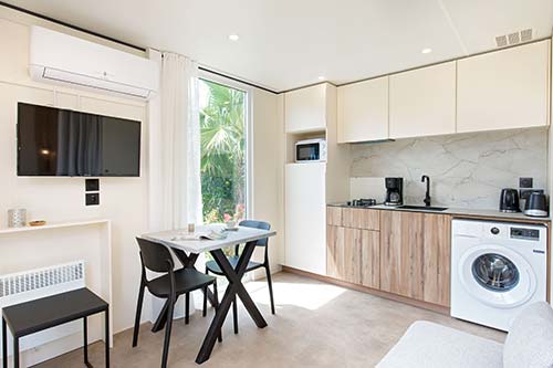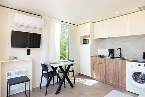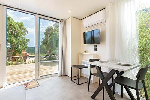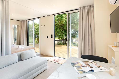 Das VIP Duo ist weit mehr als nur ein Mobilheim für zwei Personen – es ist ein luxuriöses Refugium, eingebettet in eine grüne Oase mit Blick auf das Esterel-Gebirge.
